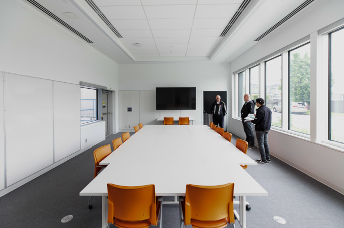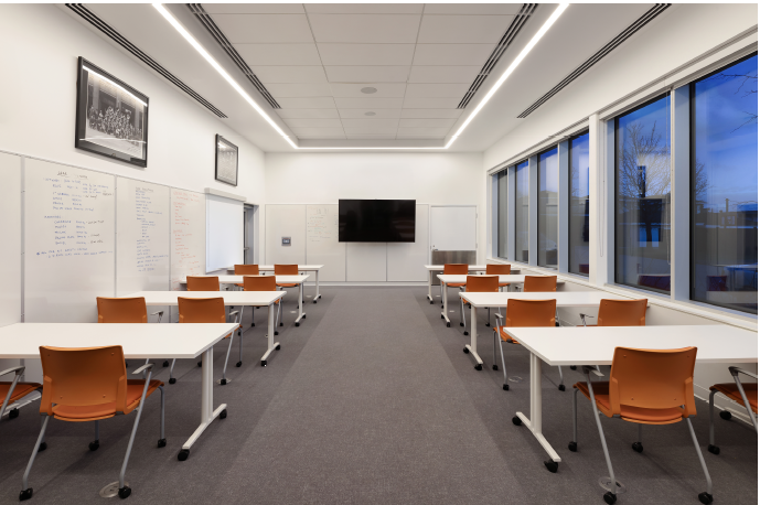 The Training Room utilizes a graphic touchscreen control providing programmed dimming zones and BACnet DDC network integration to maximize control flexibility.